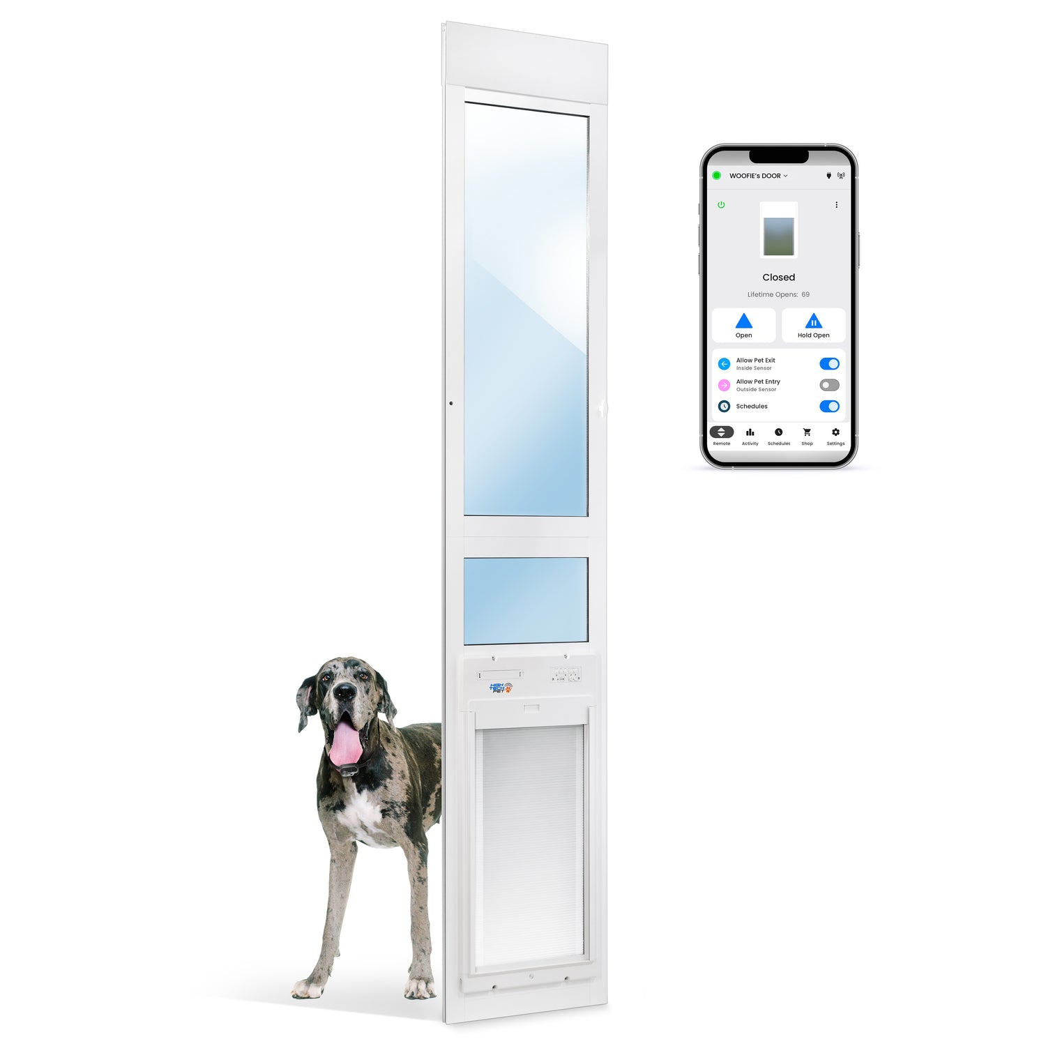 Power Pet Automatic Patio Roll Up Door. The most innovative invention in the history of pet doors. The motorized flap opens in response to your pet's special collar. The flap is strong, rigid and intruder-proof. Made of tough poly carbonate segments, which are interlocking and pivoting so they can roll up into a small compartment in the door saving valuable vertical space. The door is airtight, safe and secure. The patio panel is top quality, made from heavy gauge aluminum with a thicker frame than most patio pet doors. It features dual pane, Low-e glass for energy efficiency and a universal lock that fits most sliding glass patio doors. This is the perfect combination of state-of-the-art smart home technology, ingenious design and quality manufacturing to bring you a safe, secure and reliable product that will free you from pet doorman duty while empowering your pets.