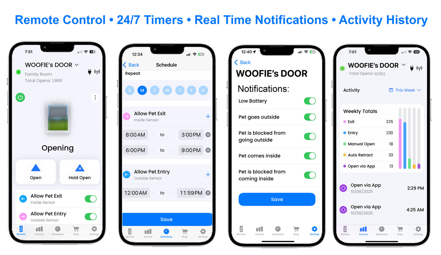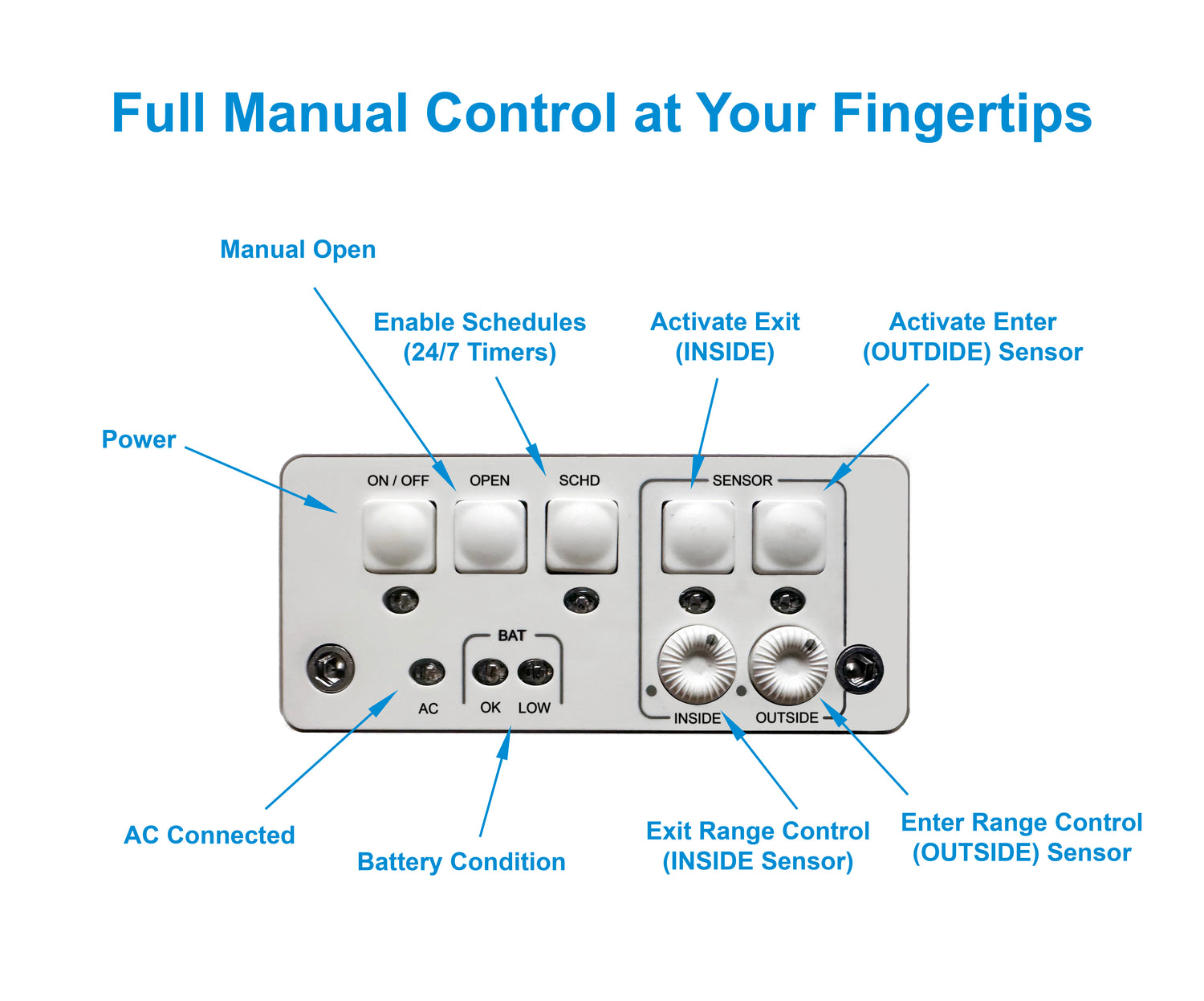 The door can also be controlled remotely using the Power Pet Door app, giving pet owners peace of mind while home or away. You can operate and monitor your pet door from anywhere with an Internet connection. You can set up timers to individually schedule your pet’s entry and exit times on a 24/7 weekly basis.